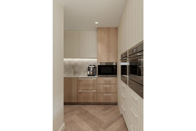 A culinary masterpiece, this kitchen features exquisite finishes, premium V-Zug appliances, and an abundance of storage. The sleek design offers both function and elegance.