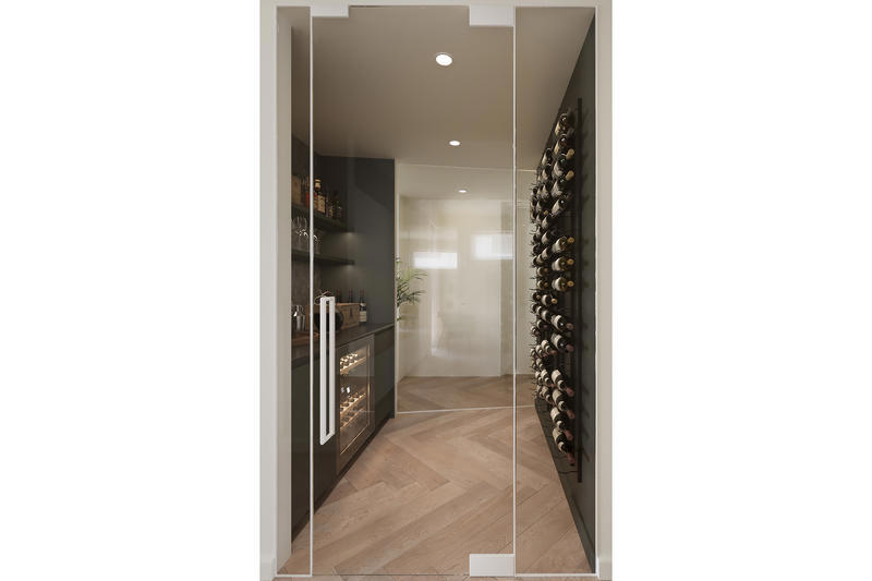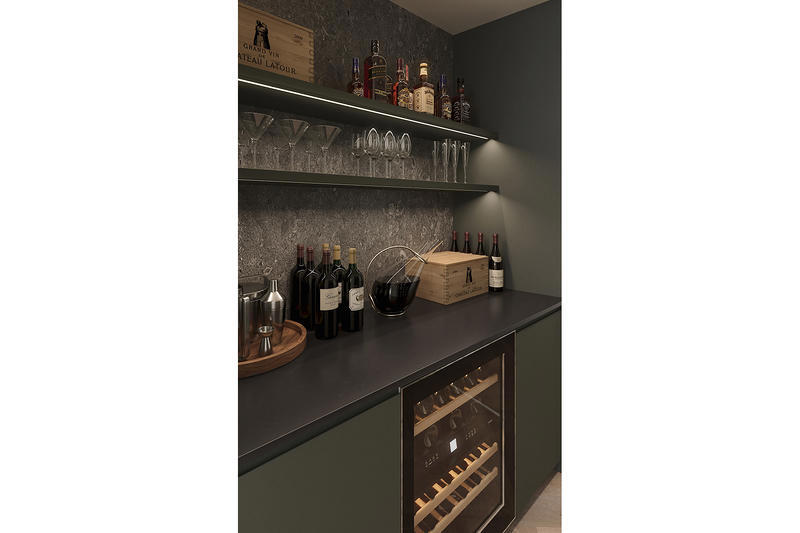 A connoisseur's haven, featuring a Vintec wine fridge, custom wine display racks, and elegant finishes for your curated collection.