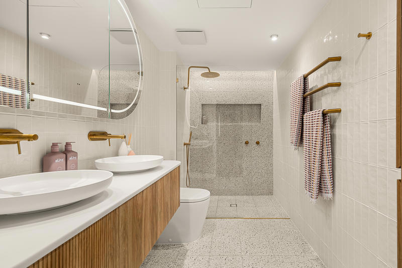 - Fully renovated main bathroom with the same golden finishes and ample storage space.