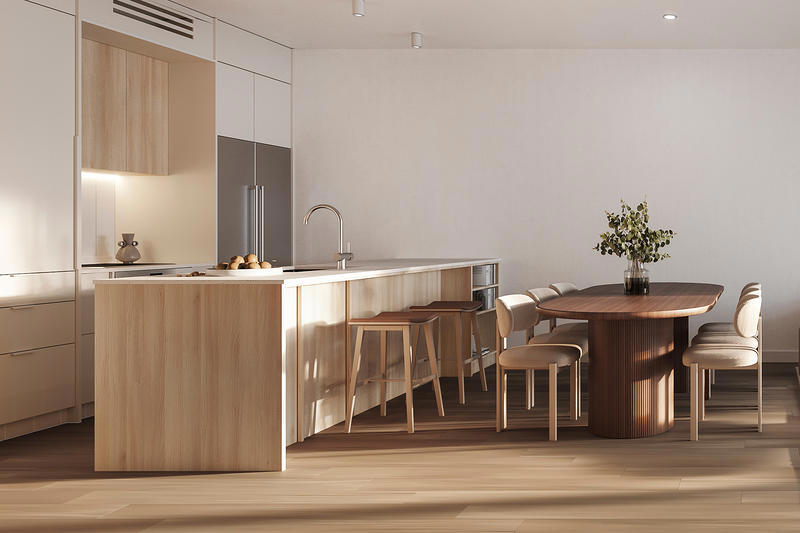 > Refined Finishes – Hybrid timber flooring in the kitchen and living zones adds warmth and sophistication, complemented by stone finishes in the kitchen and bathroom and sleek recessed downlights