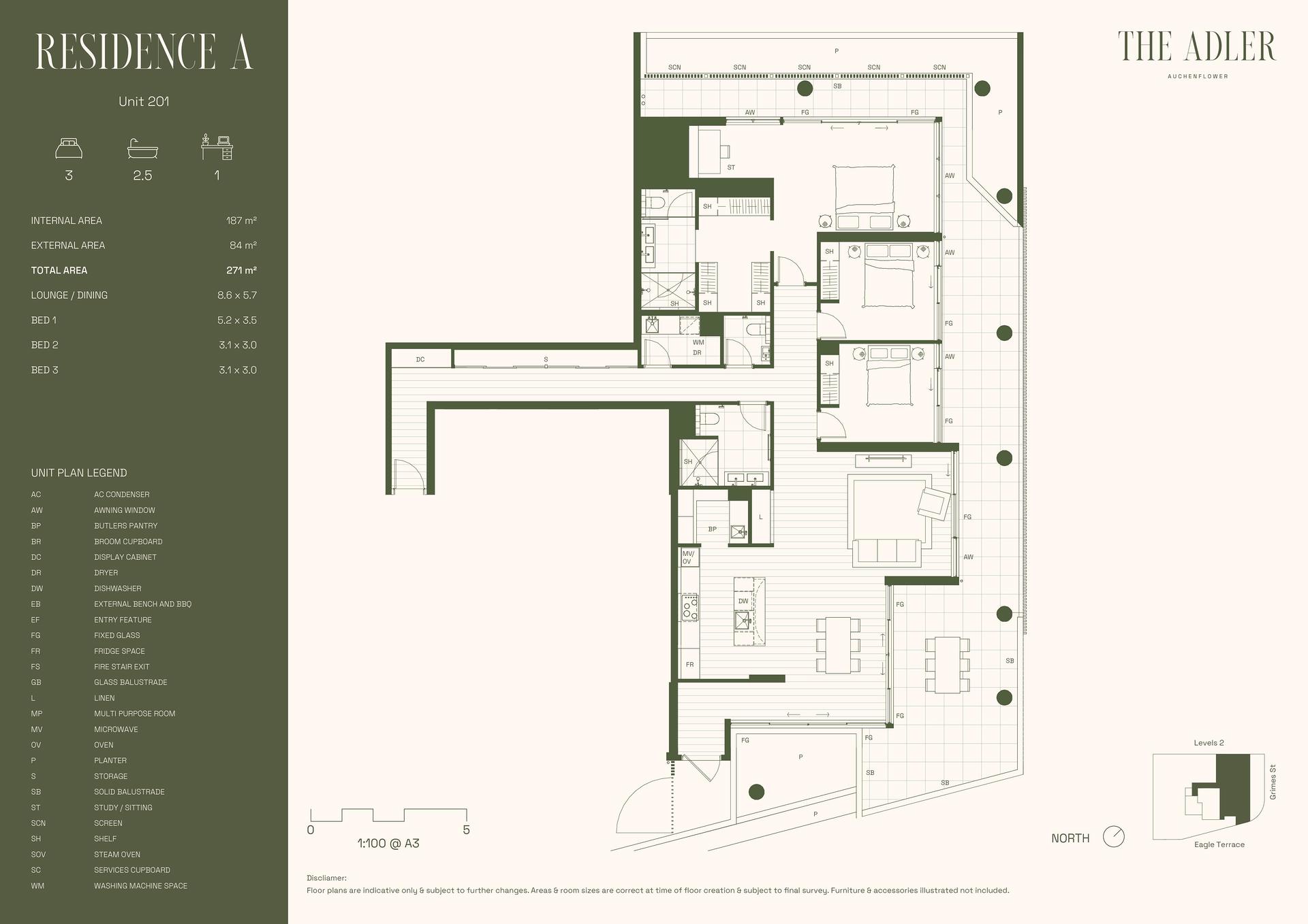 Residence 201 is a spacious north-facing home situated on the second level of The Adler. This impeccably designed 3 bedroom, 2.5 bathroom residence offers an extraordinary 187m² of internal living space, combining modern elegance with exceptional comfort. With a stunning 84m² balcony and most extensive frontage, this home is the perfect blend of luxury and tranquillity.