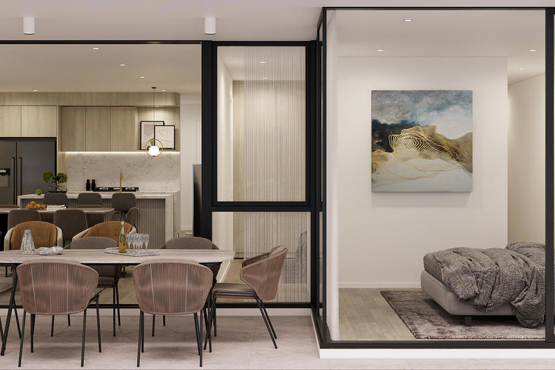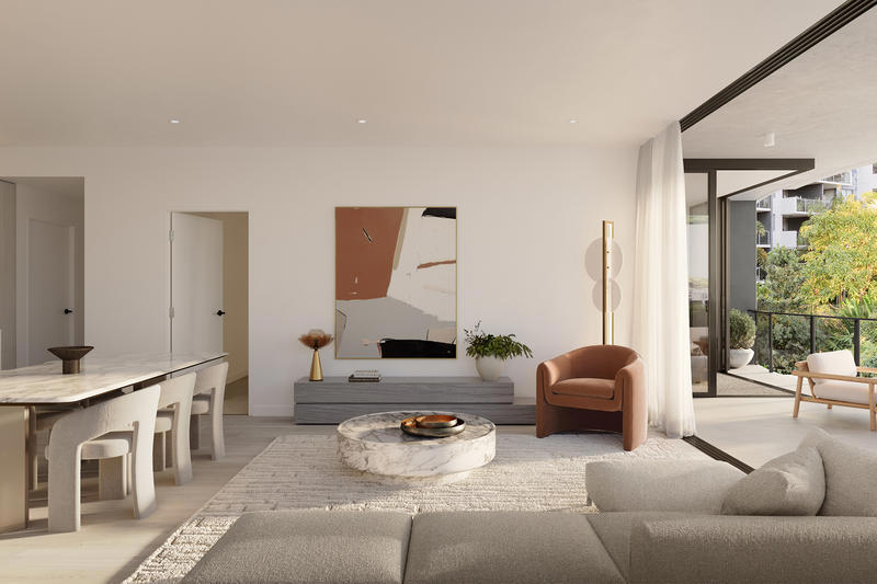 > Extensive glazing in the living area, with floor-to-ceiling glass stacker doors, connecting to the 17sqm deep balcony allows in sunshine and the flow of fresh breezes.