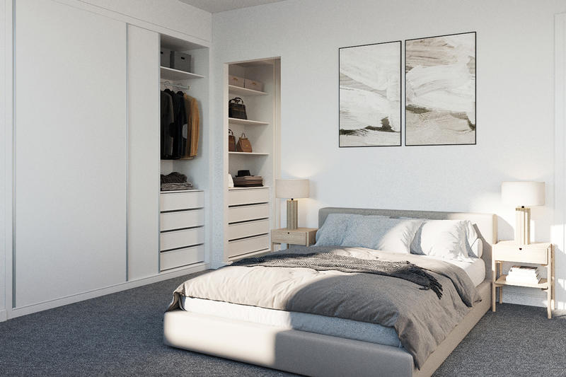 > Master bedroom with a spacious walk-in robe and a luxurious His & Hers ensuite.