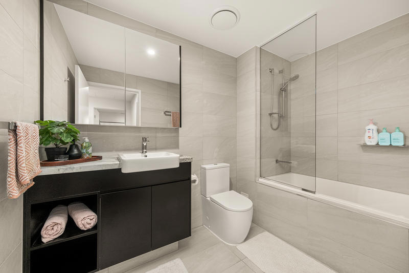 - Sophisticated main bathroom boasts a sleek stone finish, bathtub, and ample storage options.