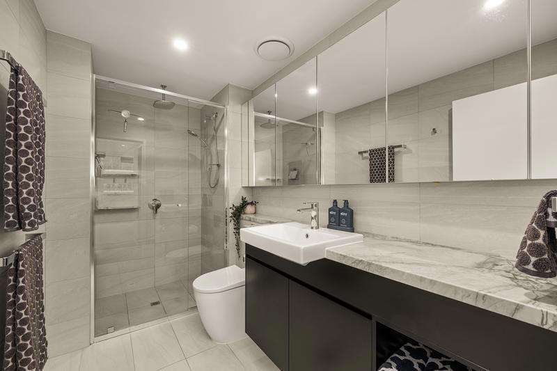 - The opulent main suite is a true retreat, boasting a spacious walk-in robe, direct access to the balcony, and a sumptuously designed ensuite. Finished to the highest standard, showcasing premium fittings, elegant stone accents, and a sleek, modern aesthetic.