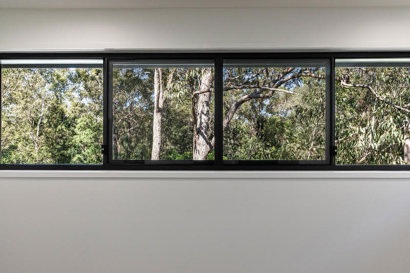 Designed by Base Architecture with Queensland's subtropical climate in mind, this home blends seamlessly with the surrounding woodland. Its striking vertical lines mirror the trees, while a thoughtful design prioritises airflow, ventilation, and privacy, all while maintaining a strong connection to nature through careful placement of glazing.
