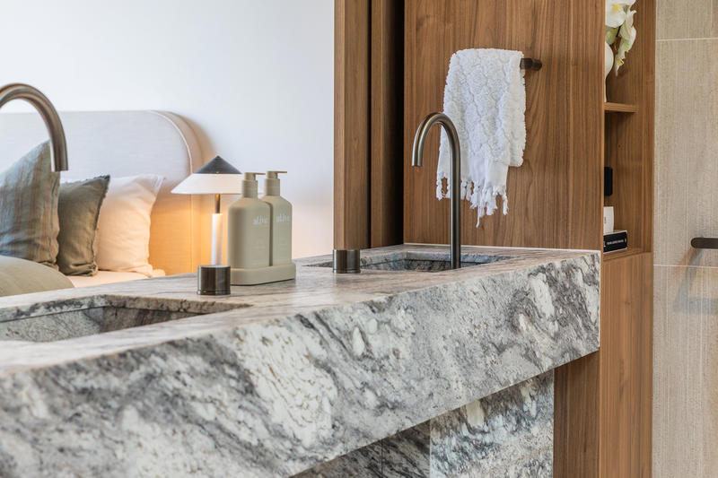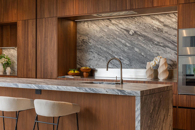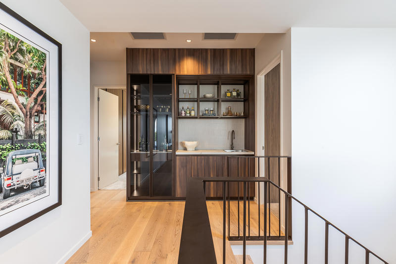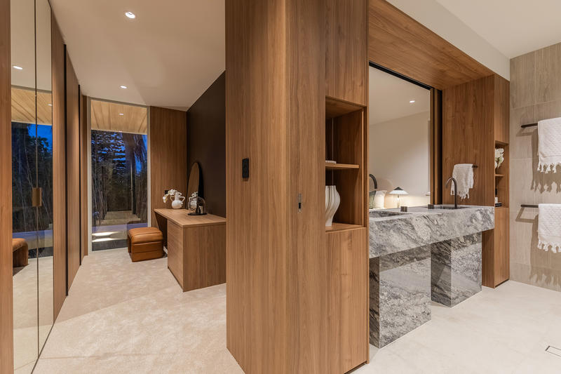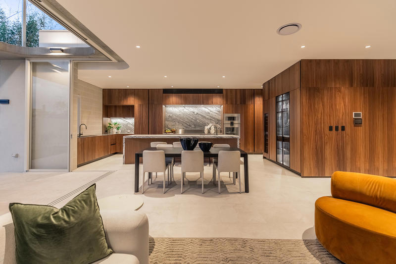 The Italian-made Binova kitchen anchors the home, showcasing Bluna wood veneer, Sant Angelo stone, and premium Gaggenau and Liebherr appliances. Expansive living and dining spaces flow seamlessly to the alfresco terrace, complete with built-in barbecue, landscaped courtyard, and pool – perfect for year-round entertaining.