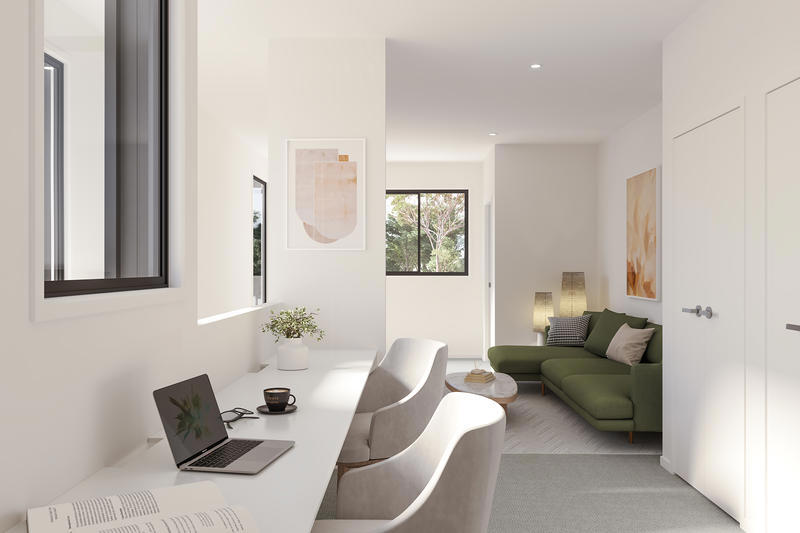 Residence 7 – a 200sqm designer home with 3 bedrooms, 2 living areas + study, 2.5 bathrooms, and a spacious double garage. Designed for Queensland's climate, this architectural gem maximizes airflow, privacy, and a deep connection to nature. Its striking vertical façade mirrors the woodland surrounds, blending elegance with functionality.