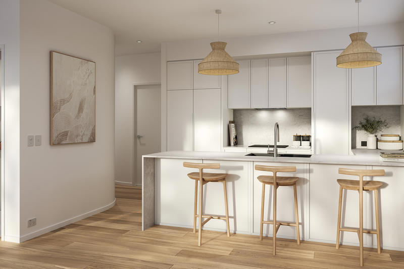 > Timber flooring throughout the kitchen and living areas, with plush wool carpet to bedrooms and tiles to wet areas, creating a harmonious blend of elegance, comfort, and practicality.