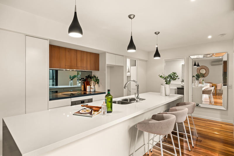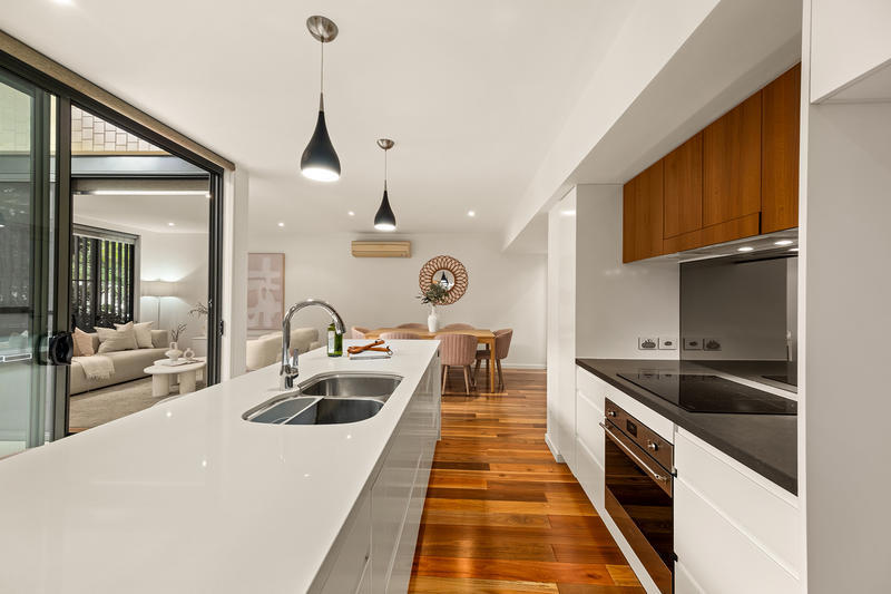 - A sleek, stylish kitchen featuring high-quality stainless steel appliances, including a dishwasher, stone benchtops, and a separate dining area.