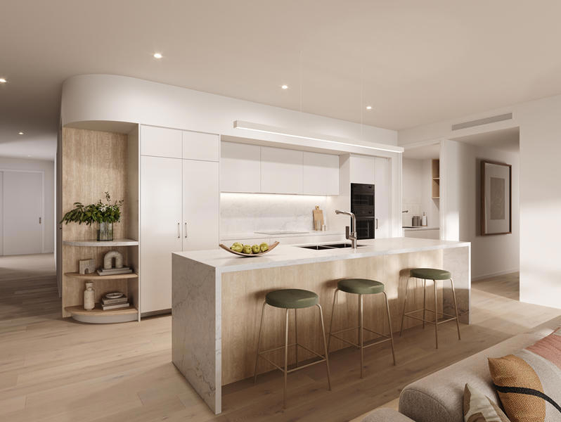 Apartment 12 features three generous bedrooms, two and a half bathrooms, and a separate media room for added comfort and flexibility. The spacious open-plan living area extends onto a 37m² entertainer's balcony, perfectly designed for relaxed bayside living and effortless indoor-outdoor enjoyment.
