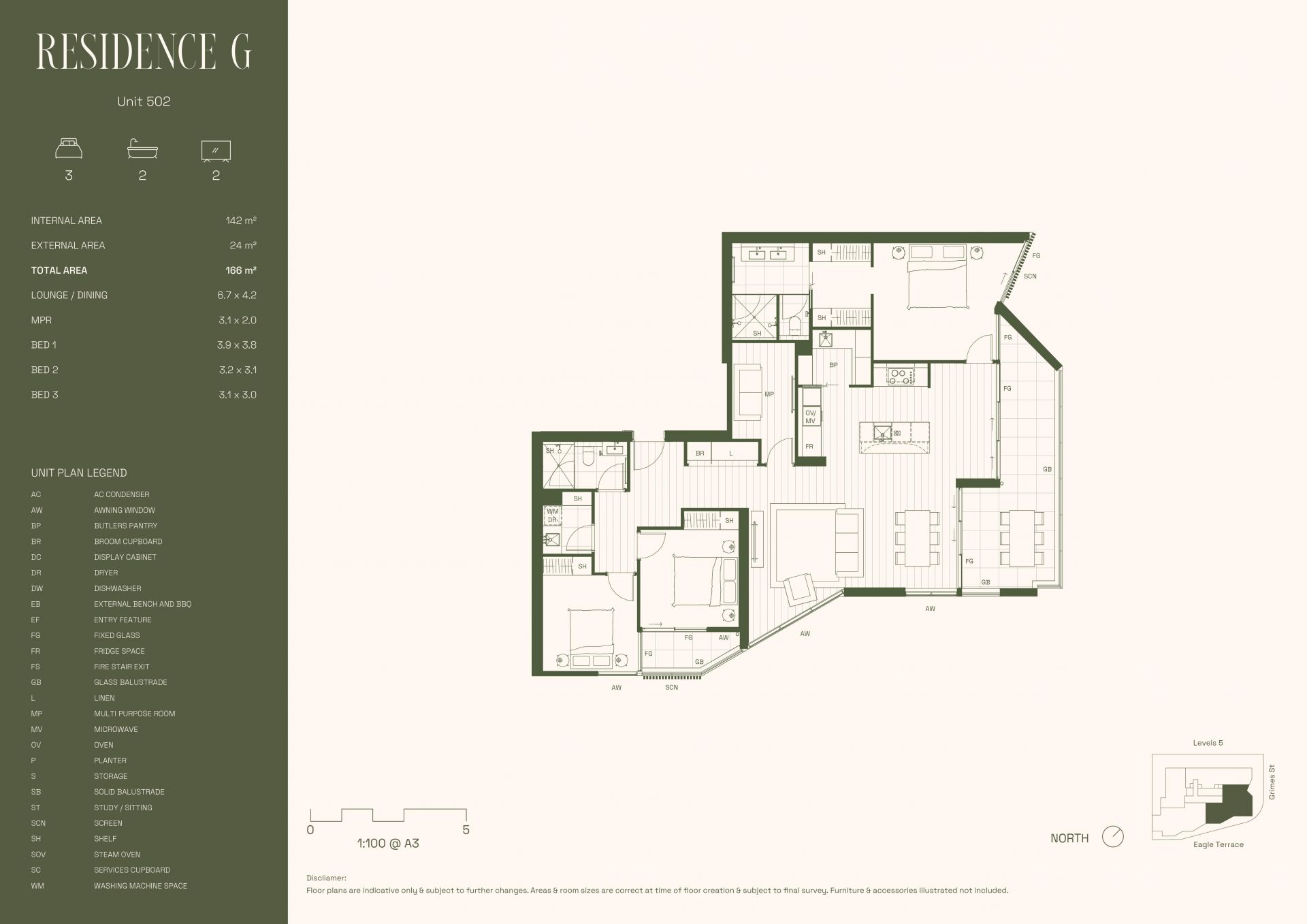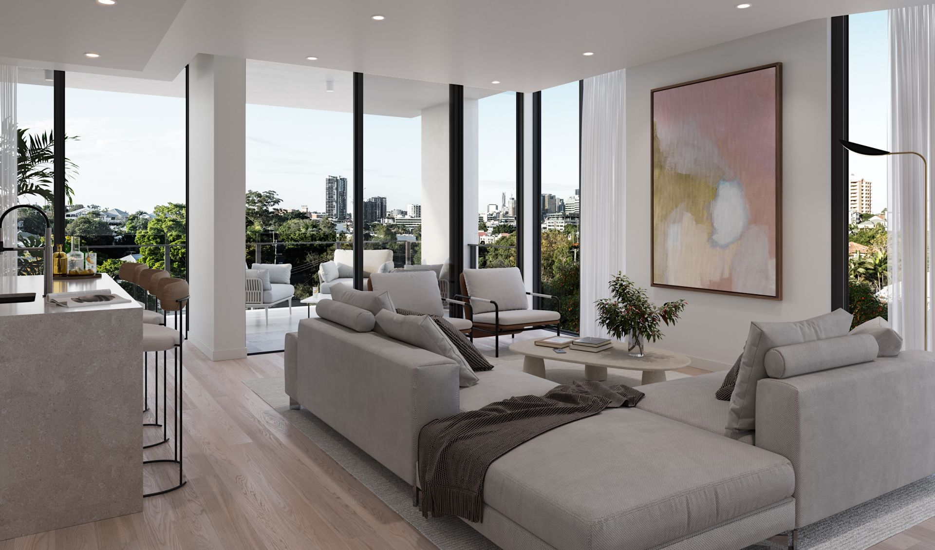 > Prime north-east facing corner residence with floor-to-ceiling glazing, offering uninterrupted city and neighbourhood views.