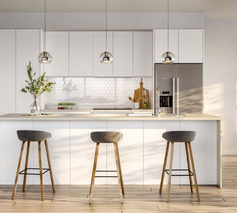 • Natural quartzite stone benchtops, engineered timber flooring and quality carpets