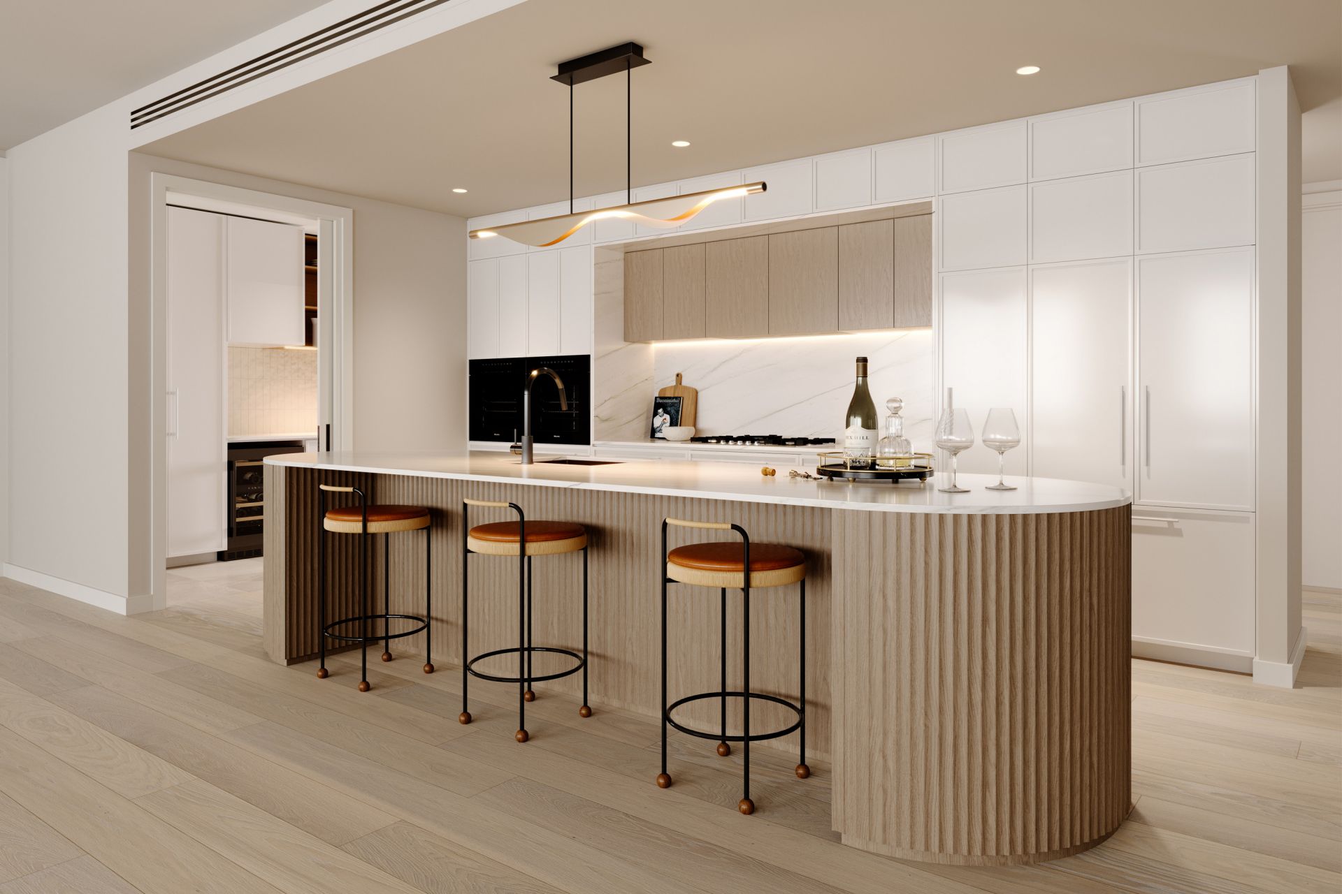 • Expansive preparation zones and bespoke cabinetry throughout