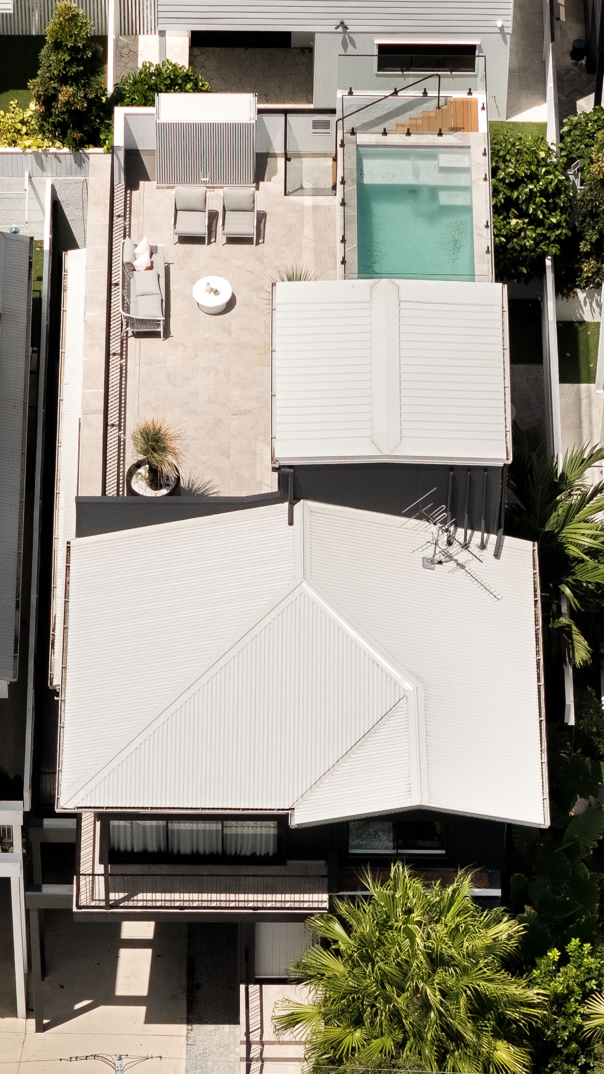 The rooftop terrace transforms the home into an entertainer's dream, featuring a Tait Tilt BBQ, swimming pool, and panoramic city and urban views.