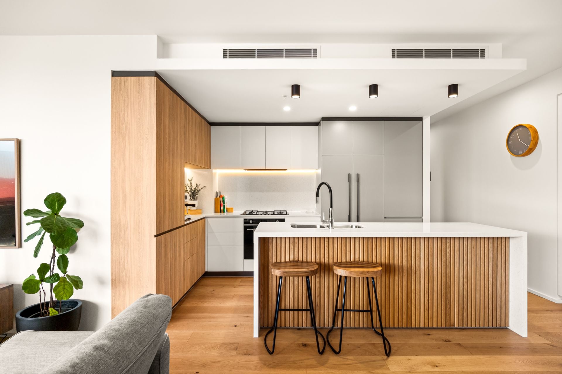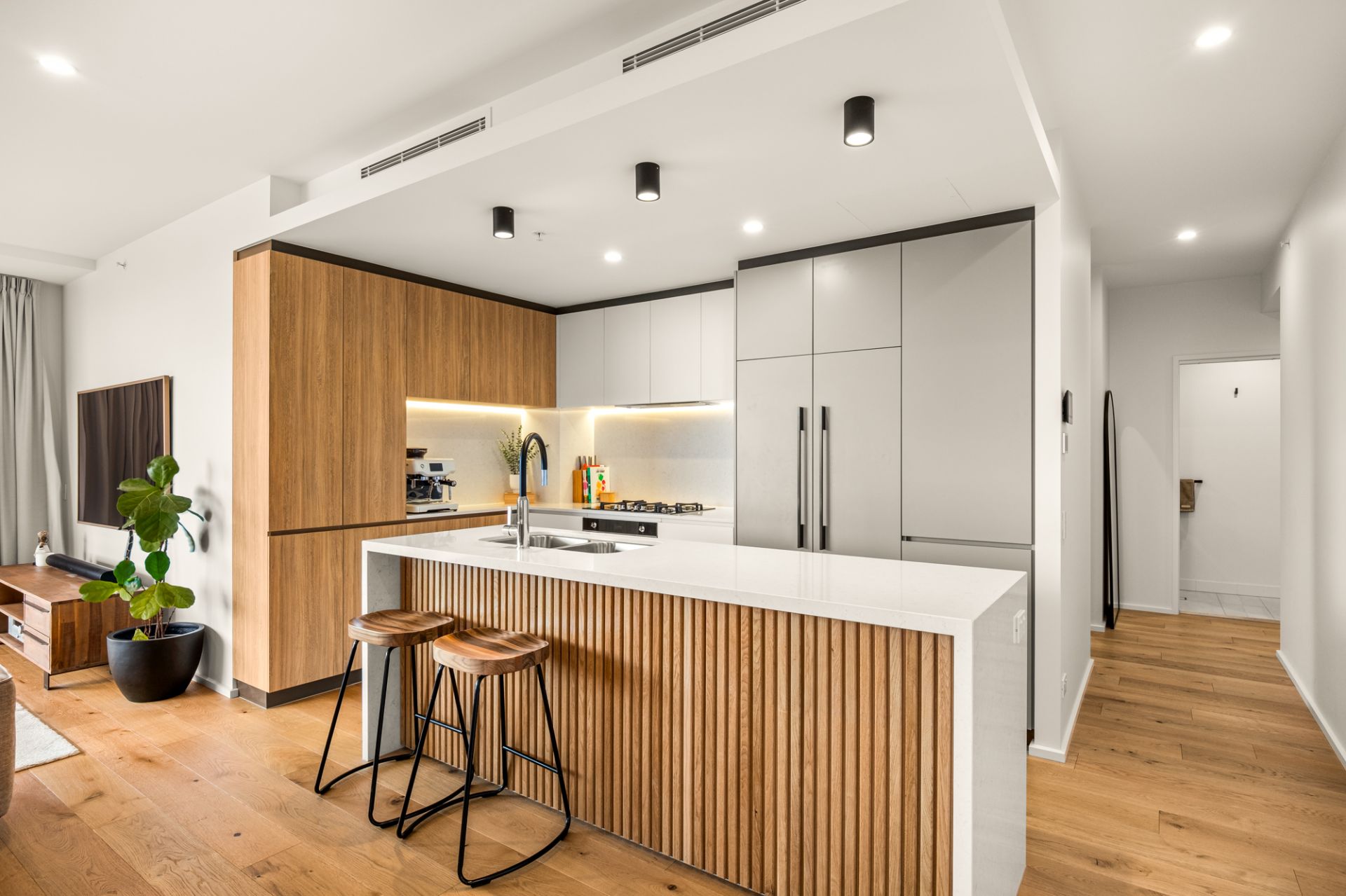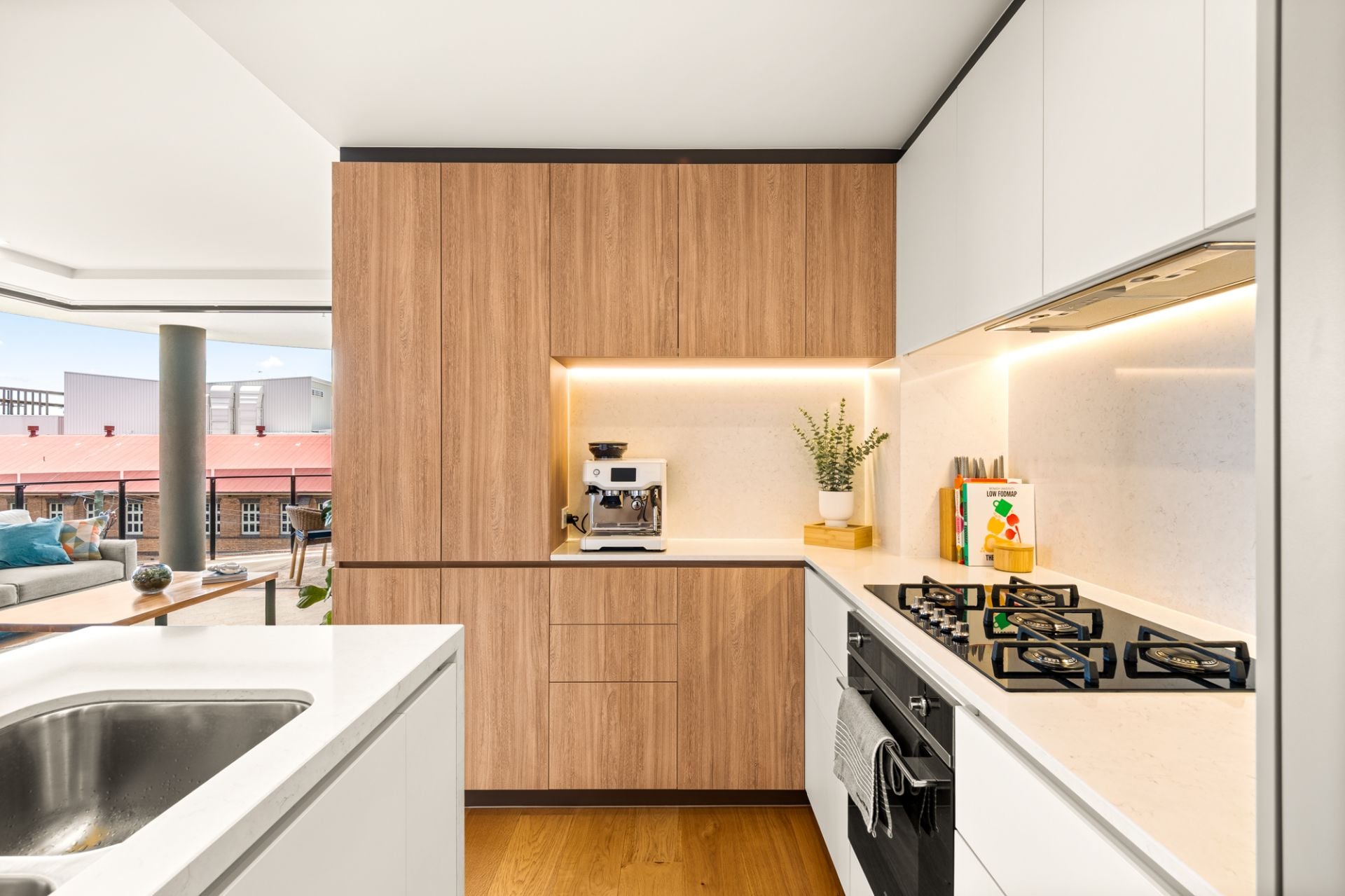 - Modern kitchen crafted for both beauty and performance, complete with premium European appliances, integrated French-door fridge and dishwasher, 5-burner gas cooktop, integrated finishes, designer tapware, soft-close cabinetry and an exceptional central island finished with stone benchtops