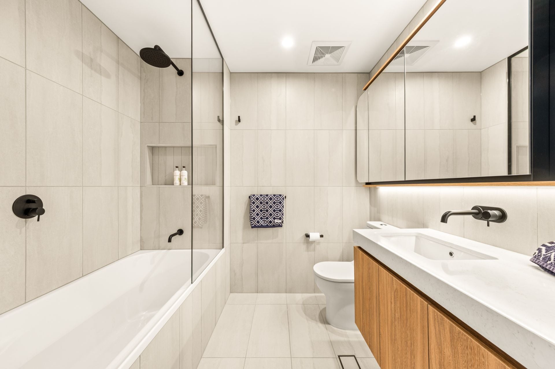 - Designer main bathroom rich in contemporary detail, complete with floating vanity storage, premium fixtures, oversized mirror, shower, bathtub and refined lighting