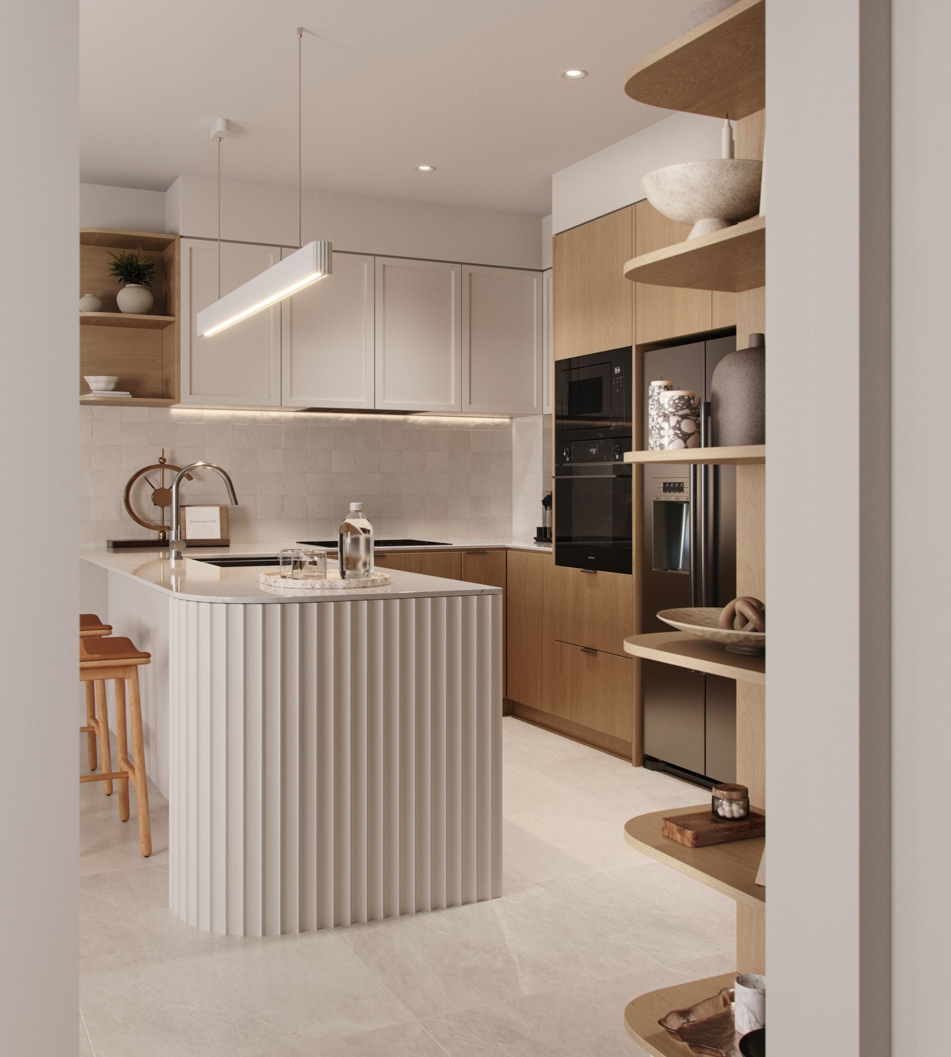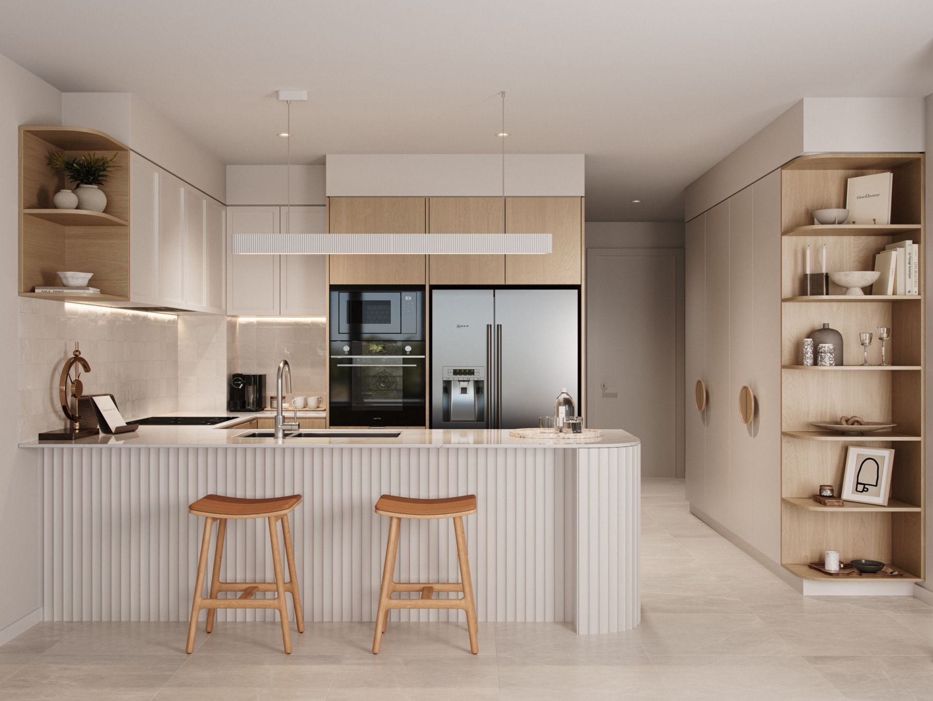 At the heart of the home, the open-plan living and dining area flows seamlessly to the private balcony, creating an inviting indoor–outdoor environment perfect for both relaxed everyday living and entertaining. A full-format kitchen anchors the space, featuring extended preparation areas, generous storage and a refined finishes palette that blends practicality with understated elegance.