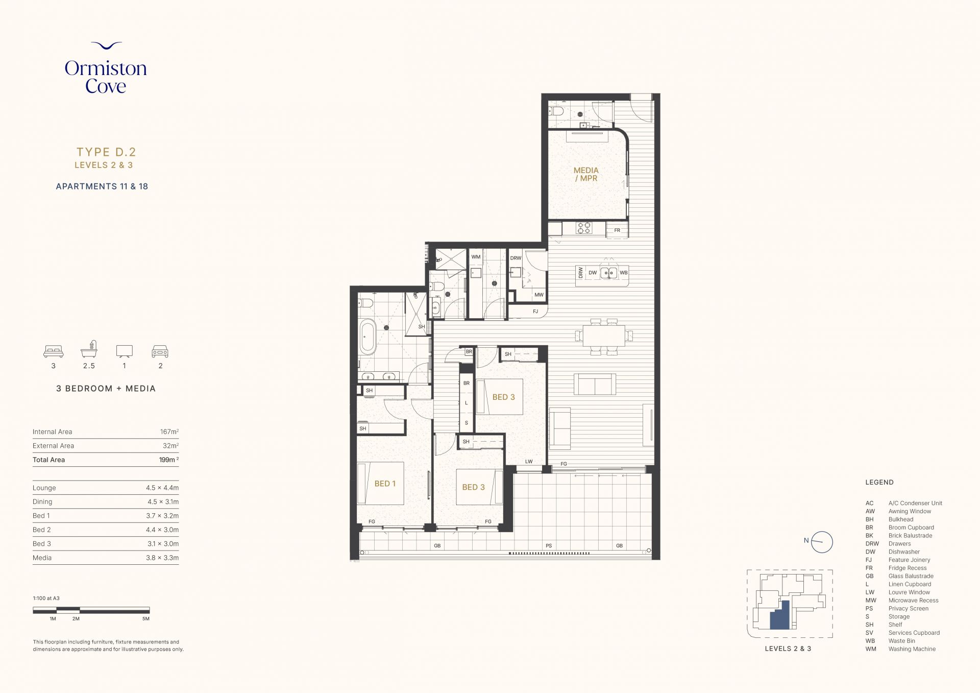 This three bedroom + multi-purpose residence delivers 167sqm of expansive internal living complemented by a 32sqm balcony. The top-floor position enhances natural light, airflow and outlook, creating a calm and refined bayside retreat.